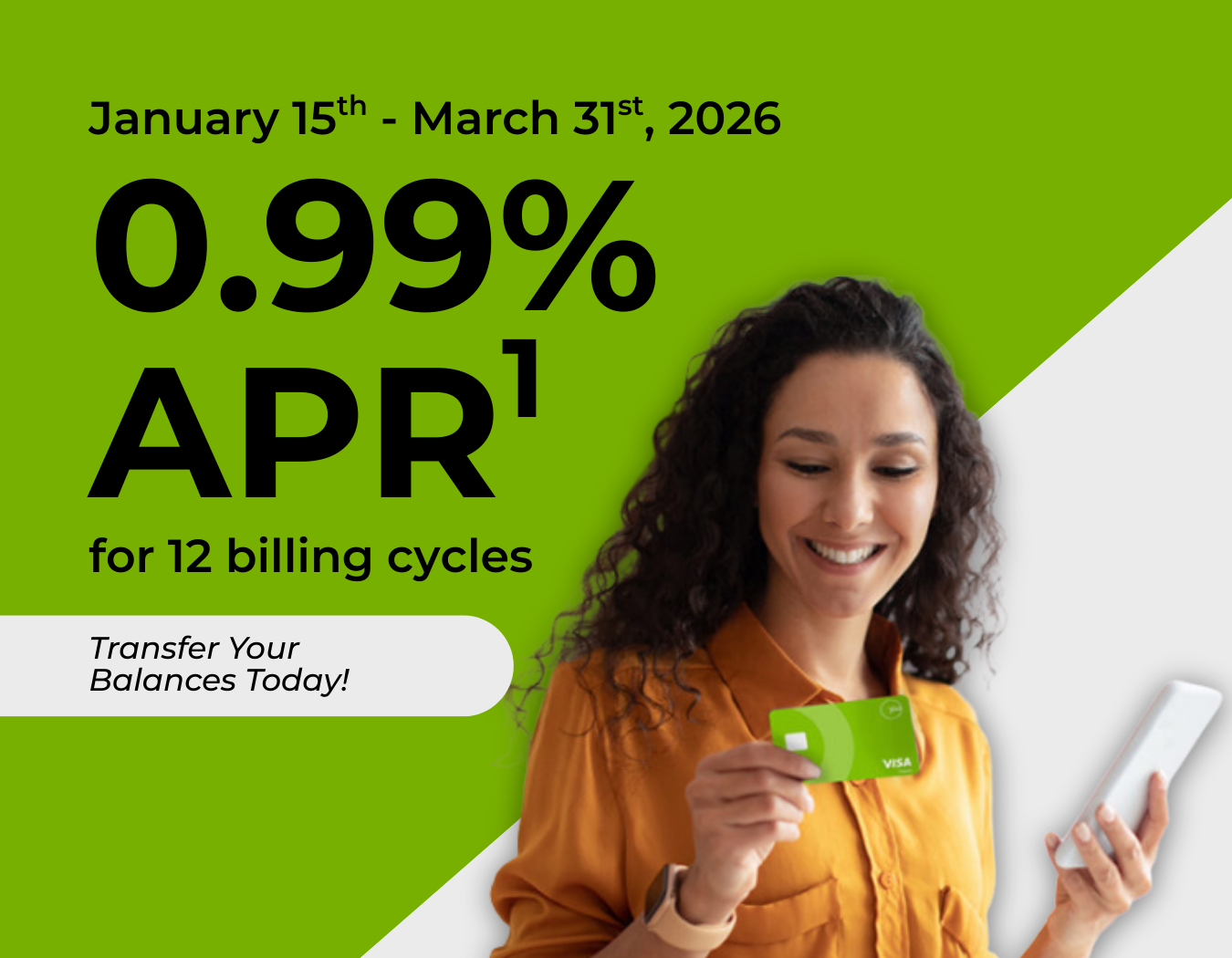 Simplify your finances and save big with our limited-time Visa® Balance Transfer Special. Cardholders can transfer balances from other credit cards to enjoy a low 0.99% APR¹ for 12 statement cycles. It’s the perfect opportunity to reduce your debt faster while saving on interest.